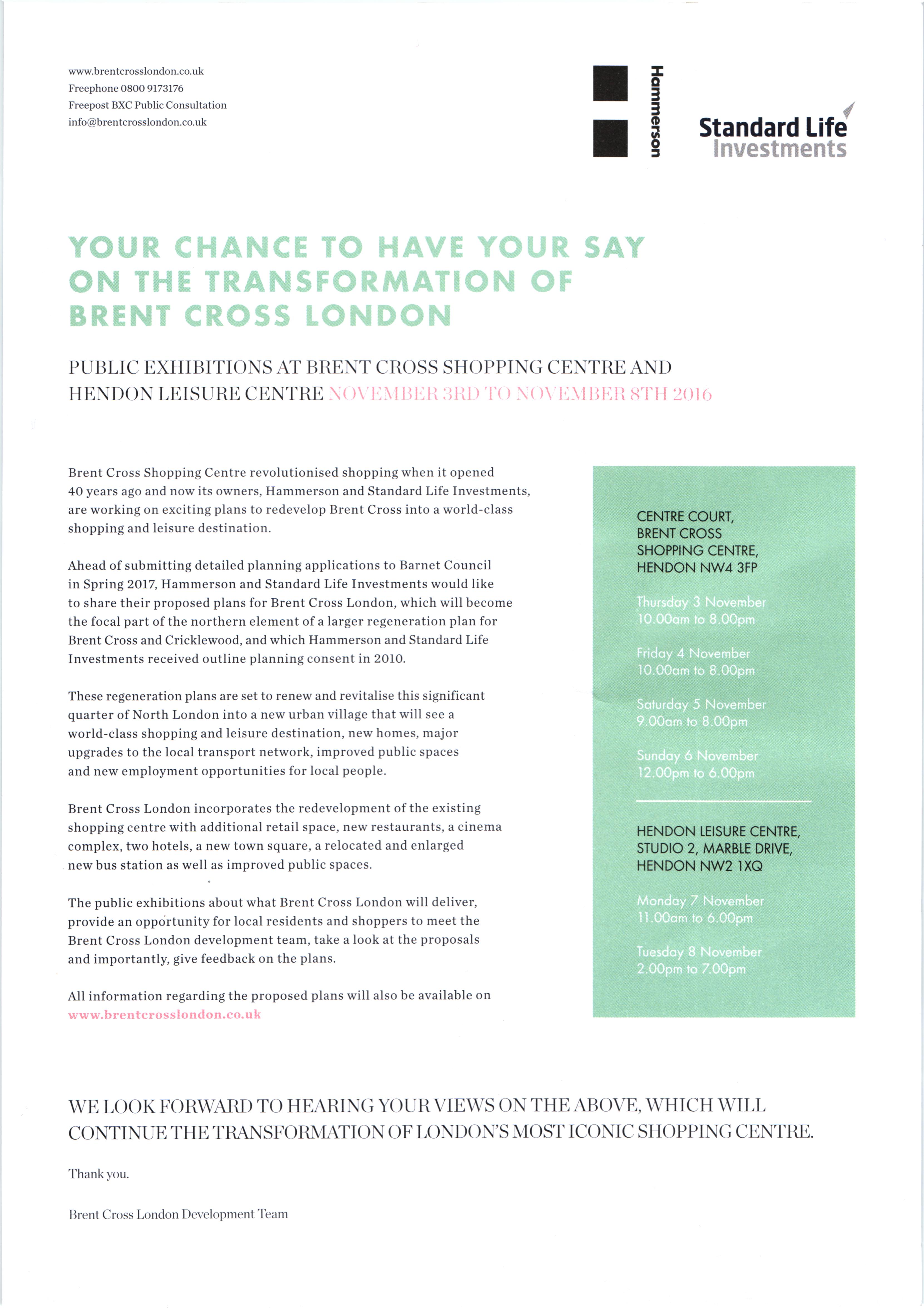 Hammerson and Standard Life aim to submit detailed planning applications to Barnet Council in Spring 2017. It seems these have to do with the northern part of the Brent Cross Cricklewood development, but they might include all the roads and bridges in both parts. Here’s the letter; see if you can work it out. Anyway, there’ll be an exhibition in the centre court of Brent Cross from Thursday 3 November to Sunday 6 November, and in Hendon Leisure Centre on Monday 7 November and Tuesday 8 November.