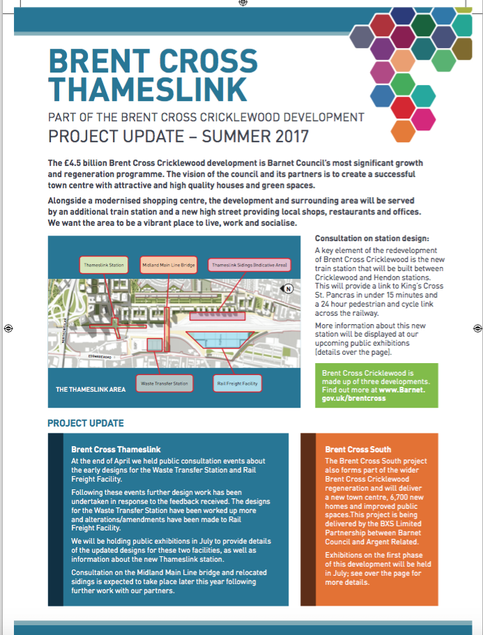 Brent Cross Cricklewood development and in particular the proposals relating to the provision of a new Thameslink train station and other important infrastructure. As you are hopefully already aware, the £4.5 billion Brent Cross Cricklewood development is Barnet Council’s most significant growth and regeneration programme, which will be underpinned by a number of major transport infrastructure improvements.