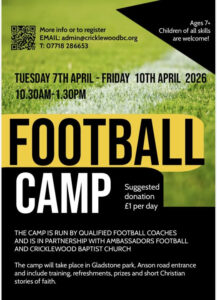 Sharing from Cricklewood Baptist Church:  “This year’s Football camp will be held in the Easter holidays and not in the Summer due to several reasons. We did not want to have no camp, especially as last year’s we had 58 youth attend during the 5 days.