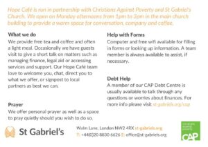 If you know someone who needs some help or simply someone to talk to please direct them to St. Garbiel’s Church on Walm Lane, NW2.