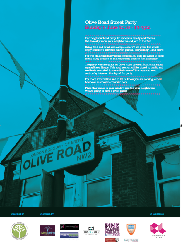 The Olive Road Street Party poster will soon be coming through your letterbox, so look out for it and display it in your window if you can. A preview of the poster is below. To get the poster in windows, we need your help. Please can you let me know if you are able to post the posters on your road? We would like to cover a large section of the neighbourhood.