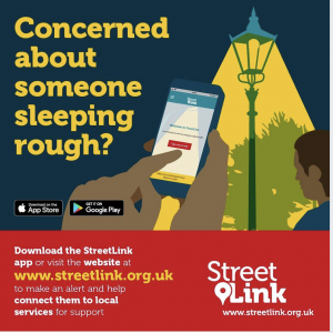 If you are concerned about someone sleeping rough, send an alert to Street Link via the mobile app or by calling 0300 500 0914.