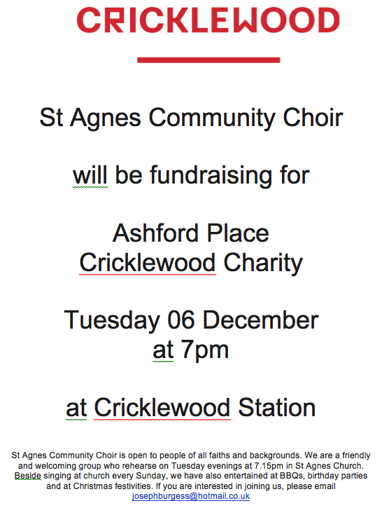 St Agnes Community Choir is open to people of all faiths and backgrounds. We are a friendly and welcoming group who rehearse on Tuesday evenings at 7.15pm in St Agnes Church. Beside singing at church every Sunday, we have also entertained at BBQs, birthday parties and at Christmas festivities. If you are interested in joining us, please email josephburgess@hotmail.co.uk